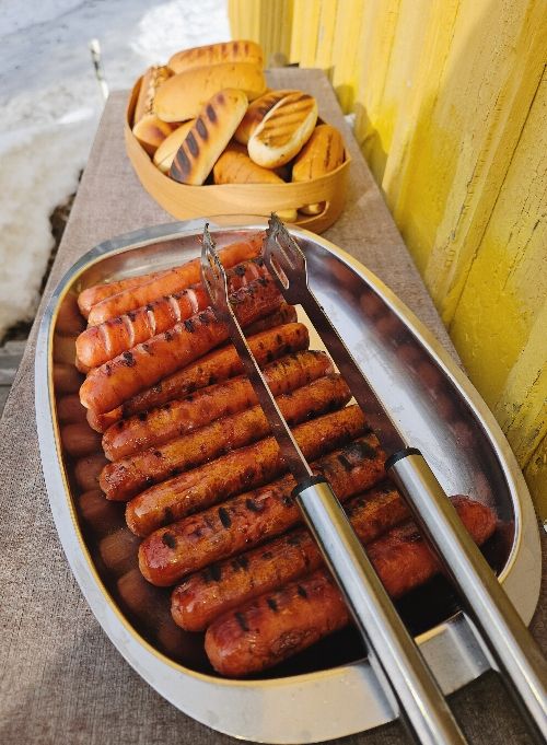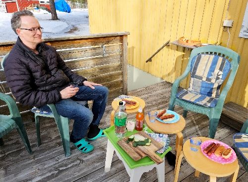 Köpte korv, skurade av plaststolarna (som får agera utemöbler tills de riktiga kommer fram), tände grillen och käkade ute på altanen.